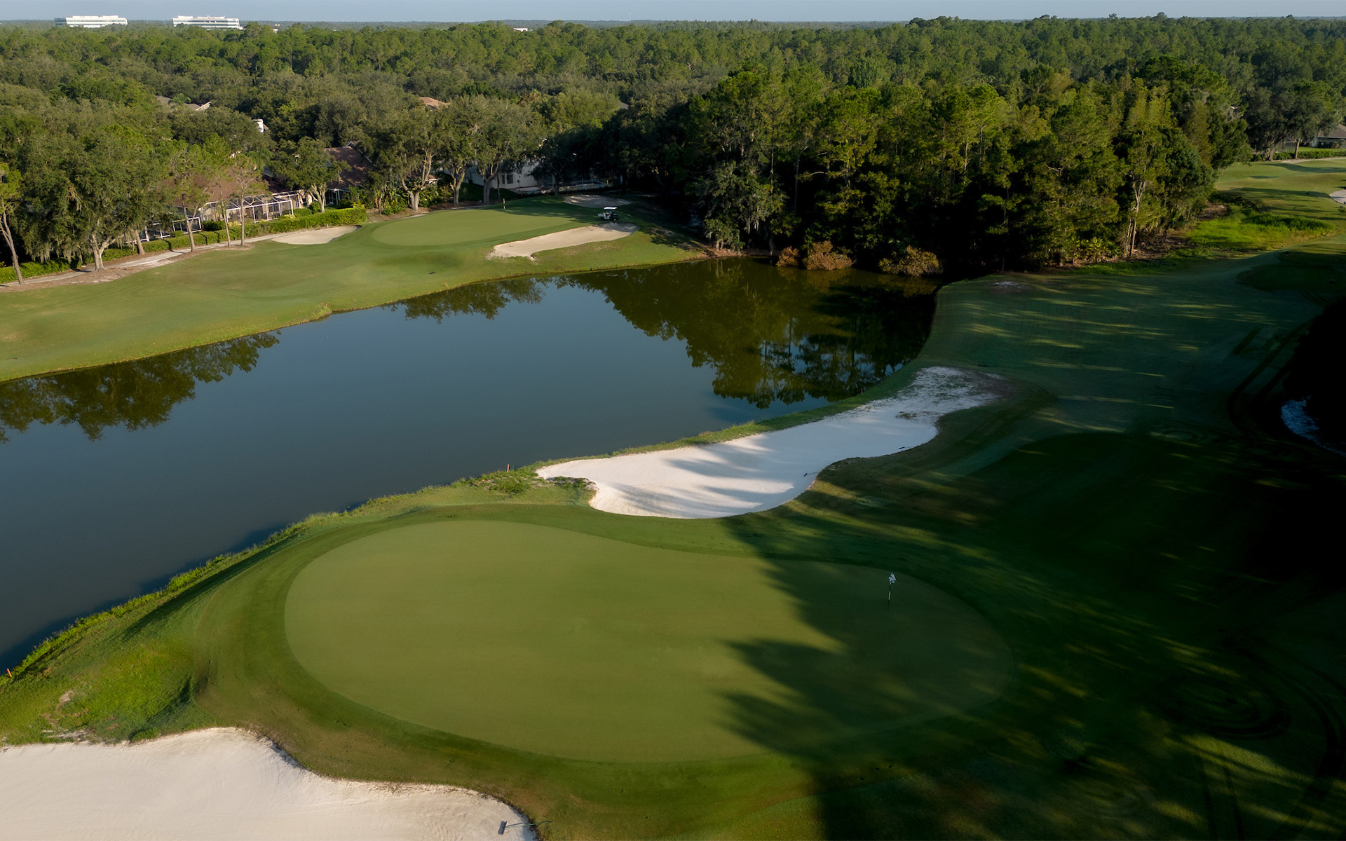 Nestled in lush Florida, Tom Fazio's golf course suits all skill levels. Carved from wetlands and pine forests, it features manicured tees, fairways leading to challenging TifEagle greens. Unlike typical Florida courses, sand bunkers, not water hazards, add challenge for a unique golfing experience. Noteworthy holes like the par-3 4th and par-4 6th contribute to a fair yet challenging adventure, culminating in the signature par-4 18th hole with its water-lined fairway and breathtaking views of the clubhouse from the final green.